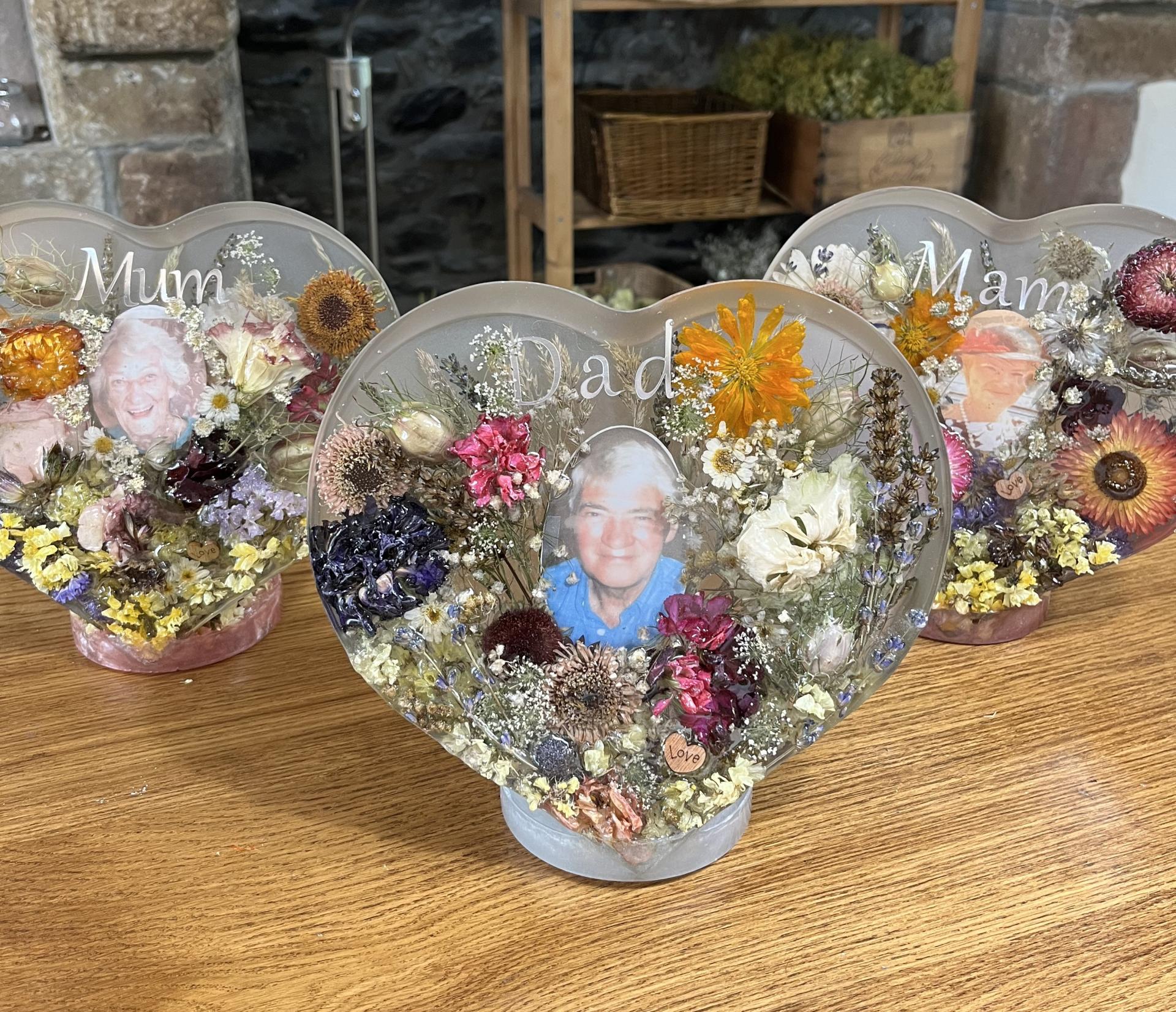 Resin art pieces can include a photo of a loved one surrounded be preserved flowers which will withstand the elements and make a beautiful tribute.